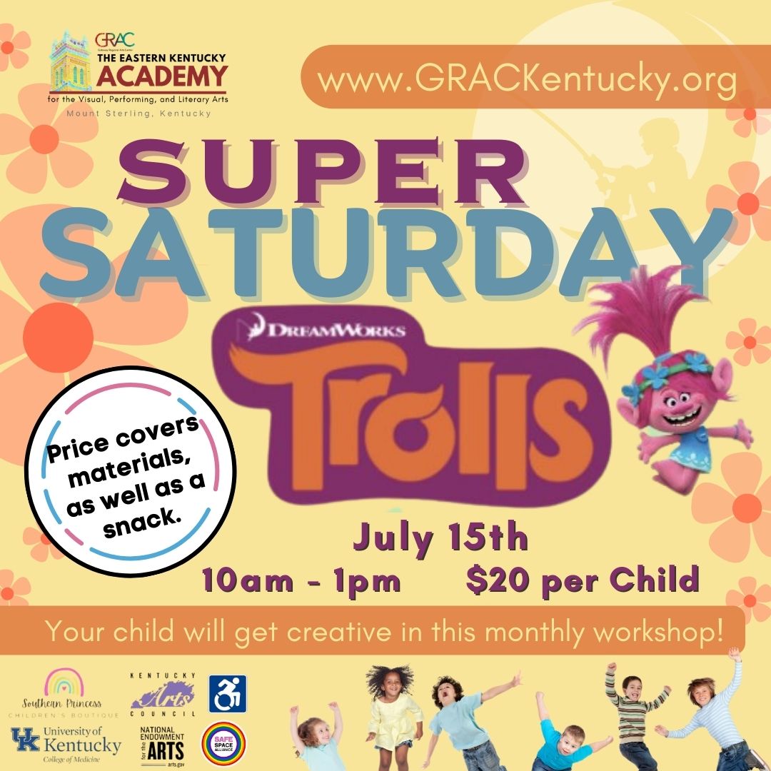 Super Saturdays are fun weekend workshops for youth ages 4-11. We will infuse art, music, theatre, creativity, and MESSY FUN for your kiddos. Each workshop includes all materials as well as a snack, and is based on a particular theme. This month, students will enjoy the magic world of TROLLS! Using endless art supplies, they will design their own troll doll, learn a song and dance from the movie, and more in this exciting Saturday morning workshop!
