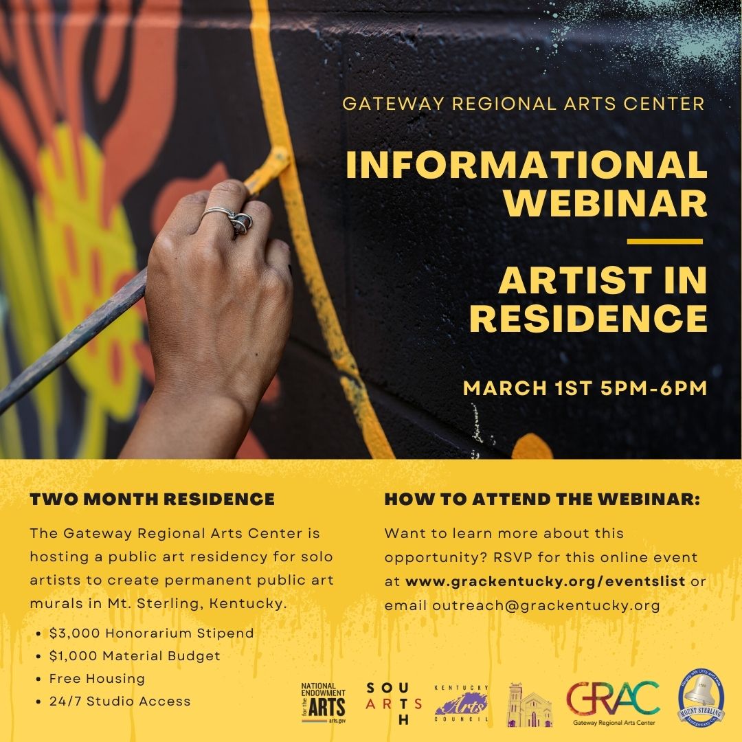 Join us for the Informational Webinar for the 2023 Artist in Residence! During this webinar, you'll hear from Gateway Regional Arts Center staff, who will provide an overview of the residency program and answer any questions you may have. We'll discuss the application process, including how to prepare your application materials, the selection process, and what to expect if you are selected. This webinar is free and open to all artists who are interested in our artist-in-residence program. Don't miss this opportunity to learn more about this exciting program and take the first step toward advancing your artistic career. Please RSVP to this online event. Follow the Zoom link below on March 1 at 5pm to attend the event.