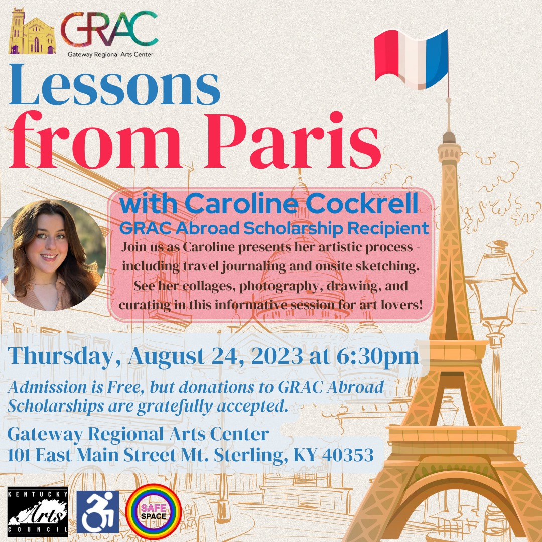 Join us on Thursday, August 24 at 6:30pm as GRAC Abroad Student Fellow Caroline Cockrell presents her artistic process - including travel journaling and onsite sketching from her fellowship in Paris, France! See her collages, photography, drawing, and curating in this informative session. If you love Paris, visual art, or European styles, you don't want to miss this!