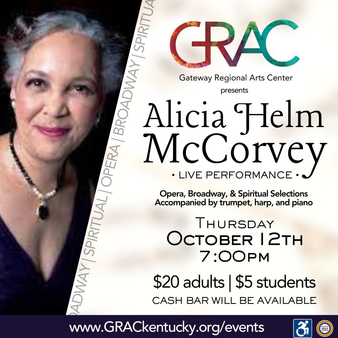 Alicia Helm McCorvey performing LIVE at the GRAC. This performance will consist of Broadway, Opera, and Spiritual selections, accompanied with trumpet, harp, and piano.